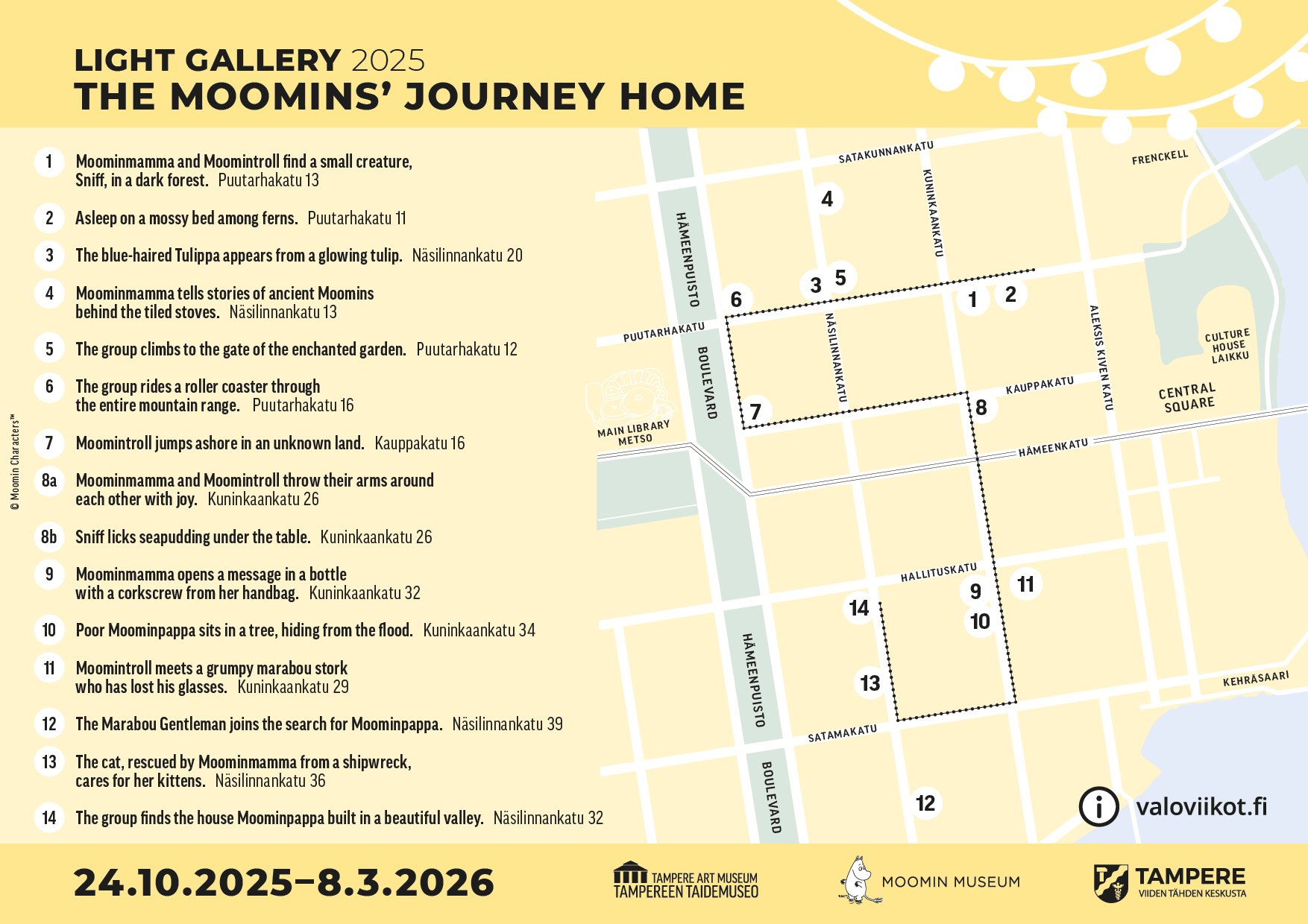 In honor of the Moomin 80th anniversary, Tampere Art Museum’s collection artist Tove Jansson has been chosen as the Light Gallery artist of 2025. The light art installation, projected onto the facades of central Tampere buildings, is titled The Moomins’ Journey Home. The illustrations have been selected from Jansson’s very first Moomin story. Light Gallery is part of the Tampere Festival of Light, opening in October.